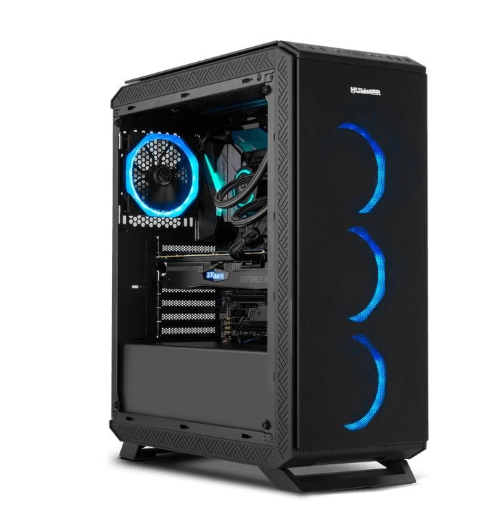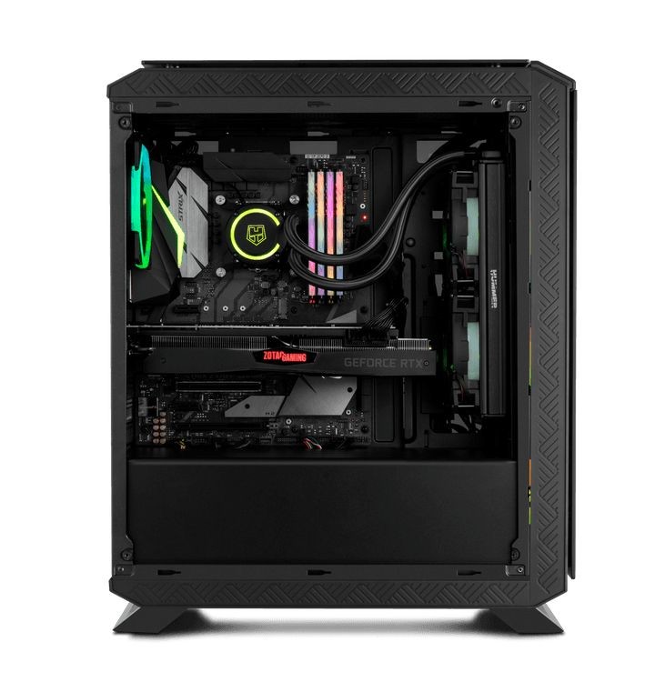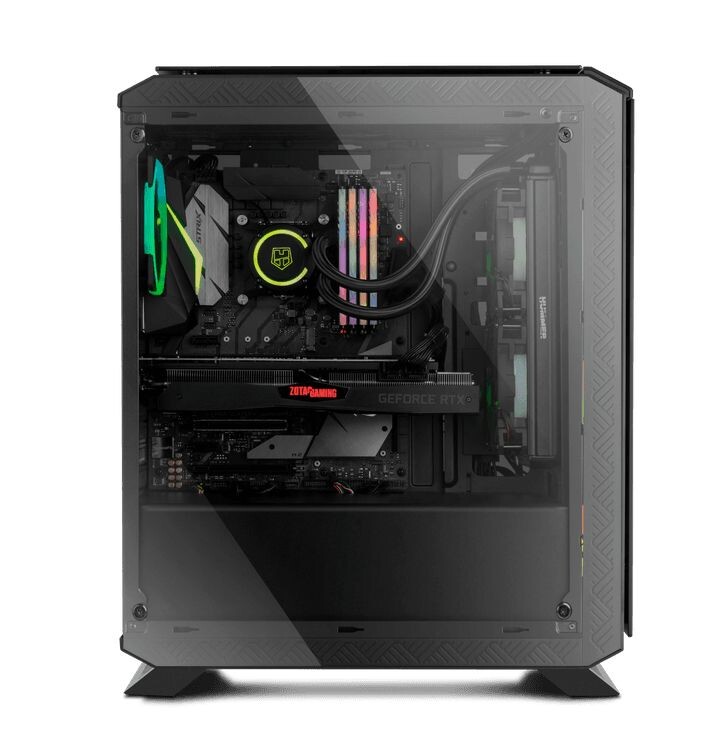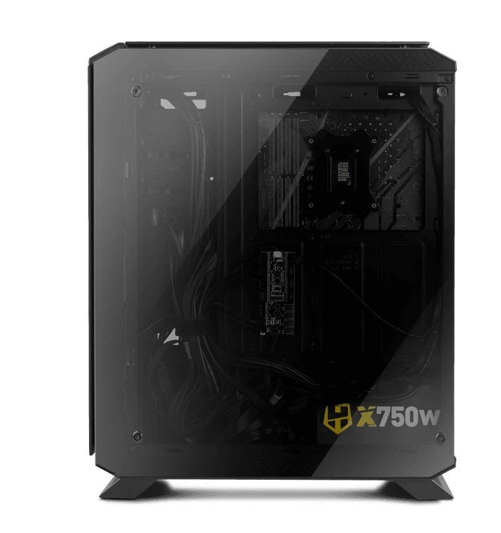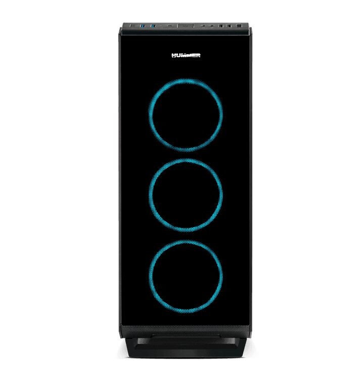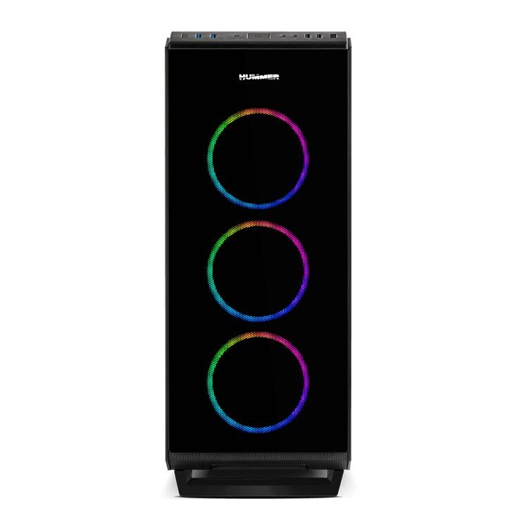 Chassis Nox com painéis lateral e frontal em vidro temperado e 4 ventoinhas RGB Rainbow pré-instaladas. Compatível com sistemas ATX, mATX ou Mini ITX. Suporta instalação de sistemas de refrigeração líquida.