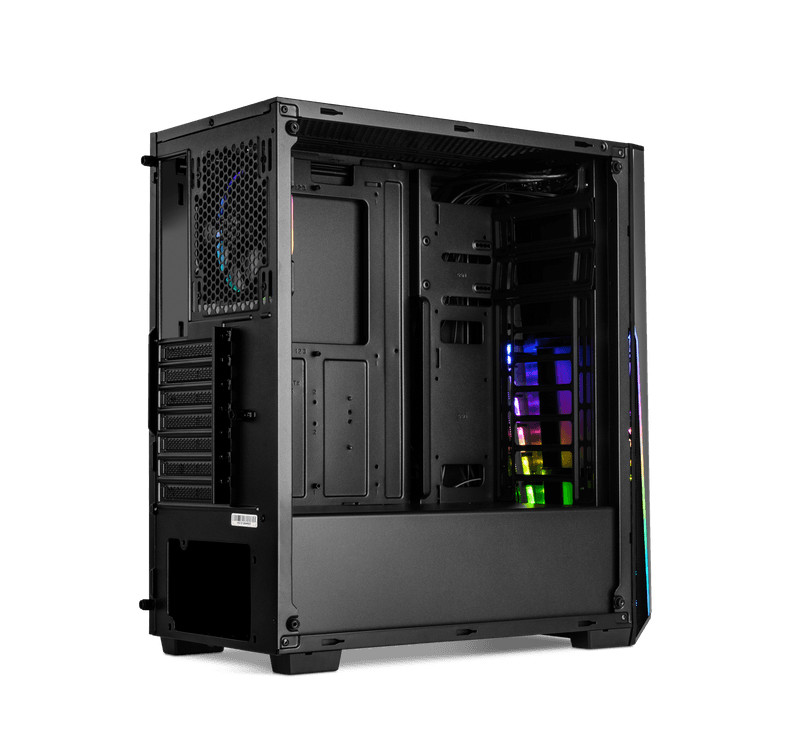 Chassis Nox com painel lateral em vidro temperado e painel frontal com faixas iluminadas RGB Rainbow. Compatível com sistemas ATX, mATX ou Mini ITX. Suporta instalação de sistemas de refrigeração líquida.